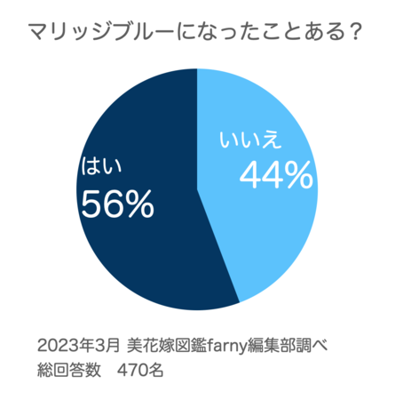 詳細記事:https://www.farny.jp/archives/dandori/marriage-manual/89842---------------------------[調査概要]表題:「マリッジブルー」に関する実態調査調査主体:PLACOLE & DRESSY (美花嫁図鑑farny)調査方法:Instagram ストーリーズ調査期間:2023年3月1日~3月10日有効回答:470名調査記事:https://www.farny.jp/archives/dandori/marriage-manual/89842