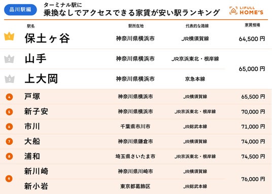 - 【品川駅】1位は6.45万円の「保土ヶ谷」JR横須賀線から4駅ランクイン!