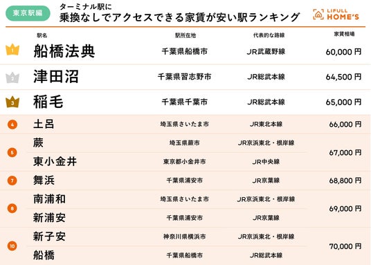 - 【東京駅】1位は6.0万円の「船橋法典」JR総武本線、京浜東北・根岸線、京葉線と多様な路線がランクイン
