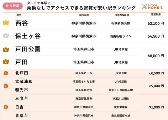 - 【渋谷駅】1位は6.21万円の「西谷」JR埼京線沿線がランクイン!