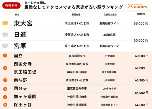 - 【新宿駅】1位は5.8万円の「東大宮」6万円台前半の駅がランクイン!