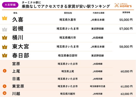 - 【大宮駅】1位は5.5万円の「久喜」大宮まで10分以内の5駅もランクイン!