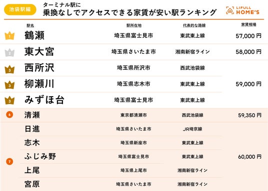 - 【池袋駅】1位は5.7万円の「鶴瀬」TOP10は6.0万円以内の駅のみに