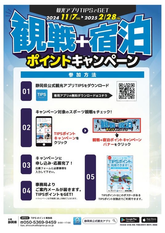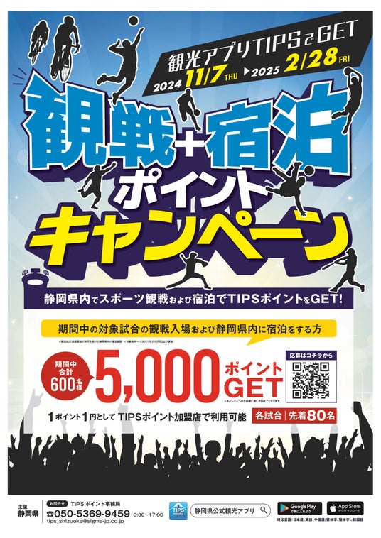 静岡県内で実施されるプロスポーツを観戦し、かつ当該観戦に際して県内の宿泊施設に宿泊する方を対象に、県内の飲食店や宿泊施設等で使用できるTIPSポイント5,000円分を付与します。