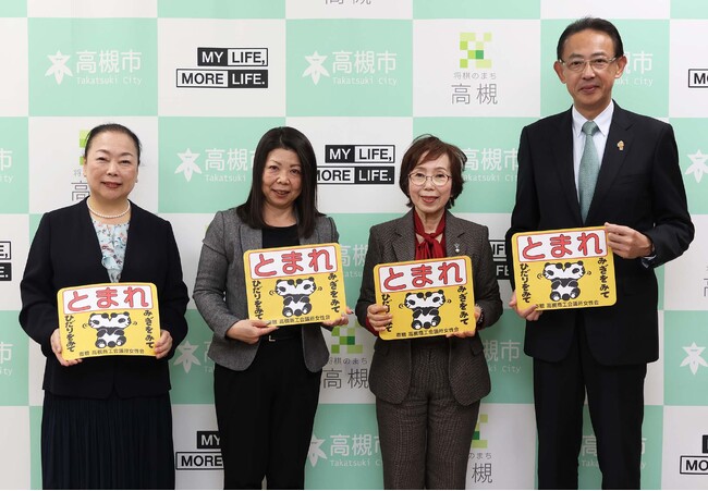 高槻市は令和6年11月27日(水曜日)、高槻商工会議所女性会から、子どもたちの交通事故防止に役立ててもらいたいとストップマーク303枚の寄贈を受けました。