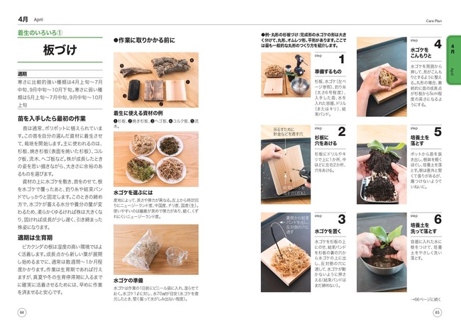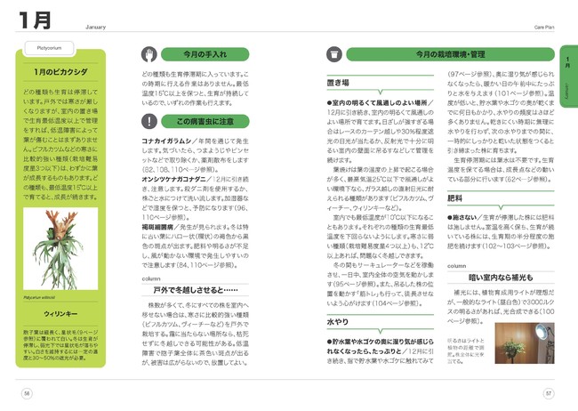 毎月何をすべきかが明確にわかるよう、各月ごとに手入れや注意すべき病害虫、管理や置き場などの情報を詳しく解説しています。また、「板づけ」「子株とり」「培養」など、ビカクシダを育てるために不可欠な栽培情報も充実しています。