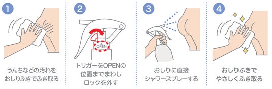 おむつ替えの時におしりに直接シャワースプレーし、おしりふきでやさしくふき取ります。