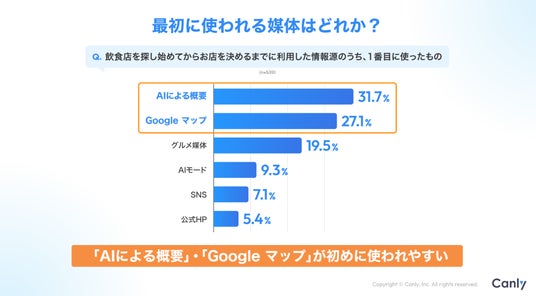 最新の調査で「飲食店を探し始めてからお店を決めるまでに、1番目に使った情報源」を伺ったところ、従来の検索方法に加えて、新たなAI検索機能が上位に食い込んでいるという結果が出ました。