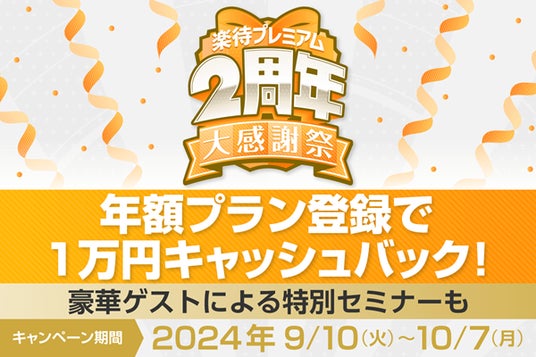 株式会社ファーストロジック(本社:東京都中央区、東証スタンダード上場、証券コード:6037)が提供する、有料会員サービス「楽待プレミアム」がサービス開始から2周年を迎えました。そこで「楽待プレミアム2周年大感謝祭」と題し、特別なキャンペーンを実施します。キャンペーンは2024年9月10日(火)から10月7日(月)までの期間限定となっています。