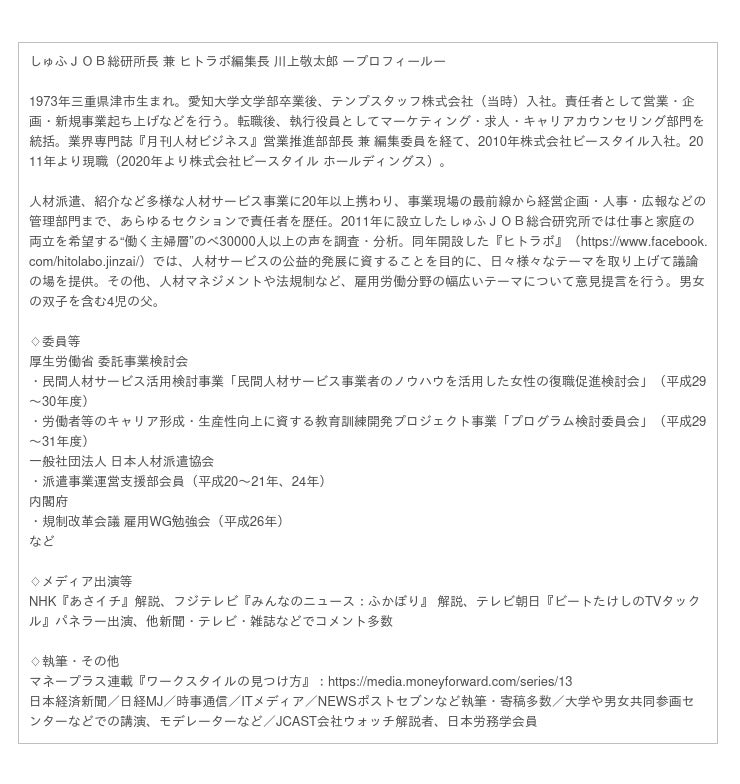 ■しゅふJOB総研 所長 川上敬太郎より