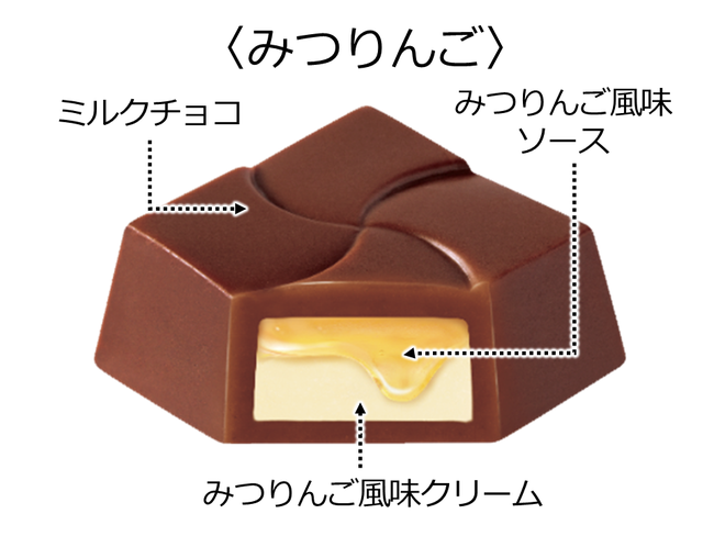 みつりんご風味のソースとクリームをミルクチョコで包みました。りんごの酸っぱさがポイントです。