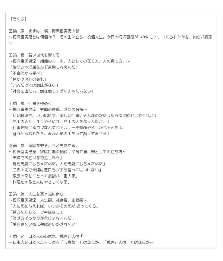 人を育てる/真っ当に生きる/一生懸命働く/家族を愛するなど、人が生きていく対目に大切なテーマのもとに、梅沢流の哲学が披露されていく。