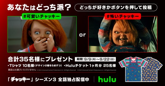 広告の掲出にあわせて、Hulu公式海外ドラマXアカウント(@HuluJapan_drama)でキャンペーンも実施中です。可愛いチャッキーと怖いチャッキーのどっち派か選んで投稿すると合計35名様にチャッキーのボタンアップシャツ、コスプレTシャツ、Huluチケットが抽選で当たります。この機会に奮ってご応募ください。