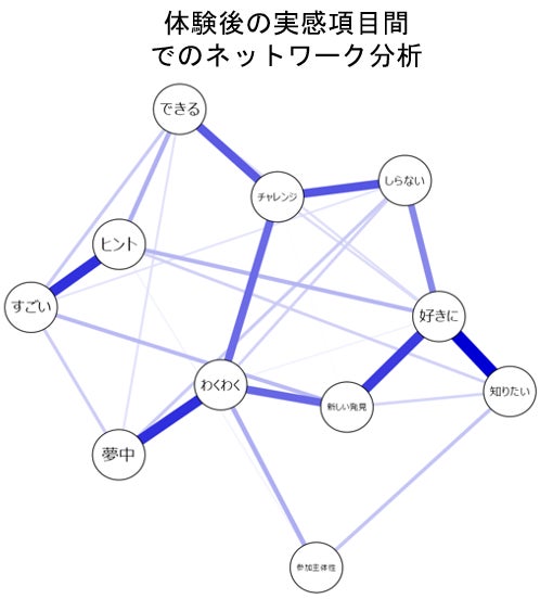 また、体験後の実感に関する項目では、体験内容に「ワクワクする、オモシロイ!と思った」「将来の自分の進路や職業についてのヒントになった」などが中心的な項目であるという結果が得られました。これらの項目が体験後の実感の中核を担っている可能性があります。