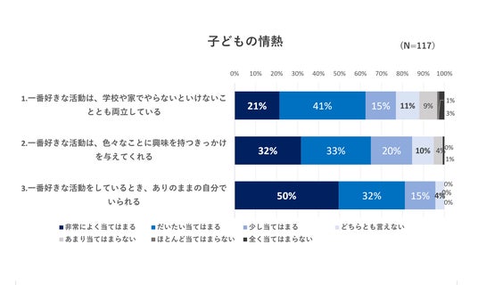 情熱に関する項目に「当てはまる」と回答した割合はおおむね高く、とくに「一番好きな活動をしているとき、ありのままの自分でいられる」という項目が突出しており、子どもが自分の「好きな活動」を見つけることの大切さを再確認した結果となりました。