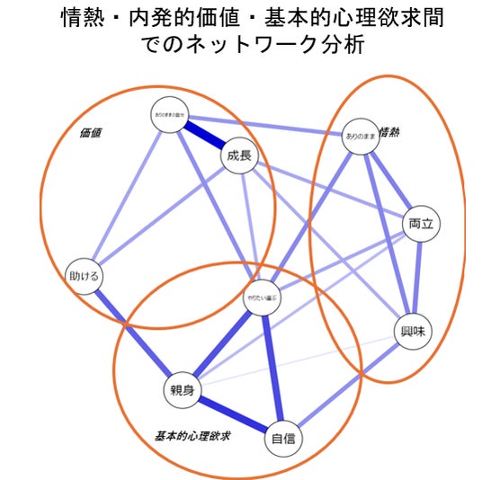 例えば、各項目の中で中心的役割を担っている項目(=他の項目と関連が多い項目)は、子どもの情熱、内発的価値、心理的基本欲求の中では、「自分自身を成長させたい」「やりたいことを選べている」でした。つまり、自己成長を望む気持ちや自己決定を支えることが、子どもの情熱のキー要素になる可能性があります。