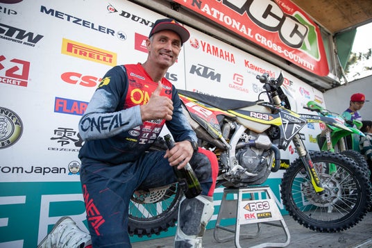 レース序盤は、4ストローク450ccモトクロッサーを駆る能塚智寛選手、成田亮選手がトップ争いを展開。その後方で、Triumph Racing Japan with RG3のエースであるグランキストは冷静にレースを組み立て、トップ集団を視界に捉えながら着実にペースを維持しました。レース中盤以降、深い砂と疲労に多くのライダーが苦しむ中、グランキストはTF 250-Eの優れたバランス性能を活かし着実に追撃。2時間経過時の19周目には6分27秒369というトップクラスのベストラップを記録し、一気にトップ争いに加わりました。
