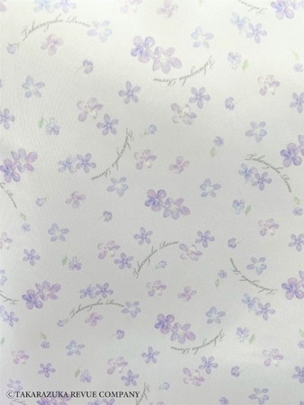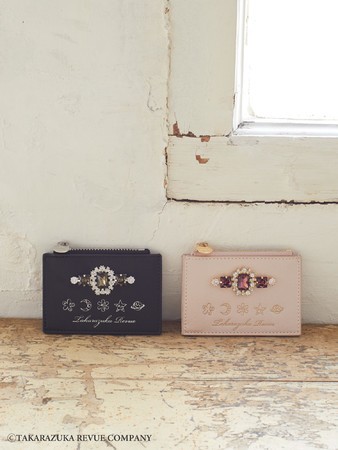 カードケースは、ビジューでアクセントを加え、組マークを箔プリントしました。一方フリルハンドルデザインのトートバッグは、宝塚歌劇のシンボルフラワーである「すみれの花」を使用したオリジナル柄の裏地がポイントです。