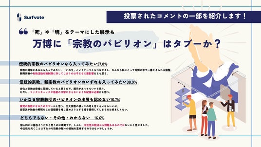 正覚寺住職の鵜飼秀徳氏がSurfvoteでみんなの意見を募集。【宗教のパビリオンに入ってみたい】を選択した人は回答者の過半数以上だった。「政治や宗教と徹底的に切り離すべき」との声も。
