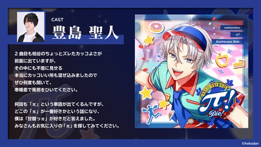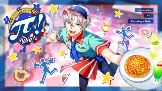 天才肌かつ「顔が良い・声が良い・高身長」の"3K"揃いな数学担当の補講男子、柏谷信(かしわや・しん)の記念すべきキャラクターソング2曲目は、株式会社Gakken監修のもと「円周率」について本格的に熱唱するパーティーソング。伸びやかな歌声はもちろんのこと、柏谷先生の新衣装やキャストによるアップルパイ調理シーンが登場するミュージックビデオにも注目だ。