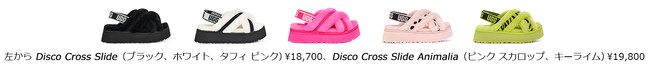 Disco Cross Slide(ディスコ クロス スライド)は、発売中のDisco Slideのアッパーをクロスのデザインにアップデート。定番色に加えてトレンドにあわせたカラーリングやキャッチ―なアニマル柄Disco Cross Slide Animalia(ディスコ クロス スライド アニマリア)も展開。ふわふわのアッパーにやわらかなシープスキンのインソールが心地よく、約4.4cm高のプラットフォームソールはファーがないから屋外でも気兼ねなく履けて、お出かけのスタイリングの外しアイテムとしても活躍すること間違いなし!