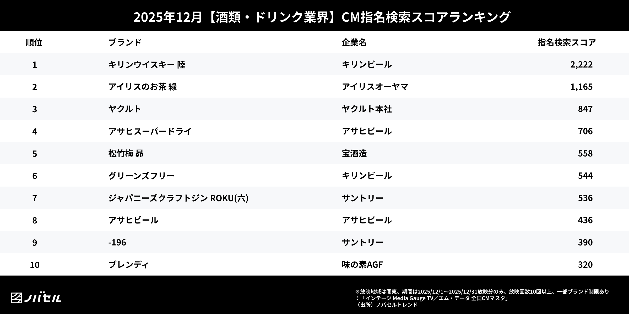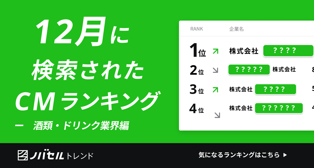 ~ノバセル発表、2025年12月 視聴者が検索したテレビCMランキング【酒類・ドリンク業界編】~