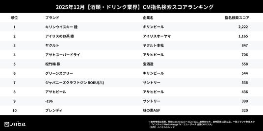 あらゆるテレビCMの指名検索スコアが可視化できる「ノバセルトレンド」を用いて、2025年12月の「酒類・ドリンク業界(*¹)」における指名検索スコア順テレビCMランキングの上位10位をご紹介します。