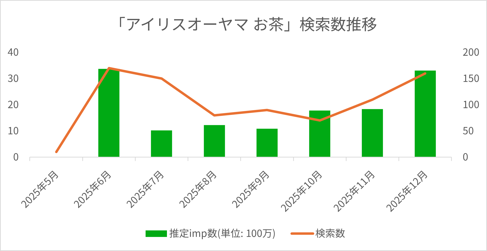 2025年6月の「綠(りょく)」発売以降、吉沢亮さん出演のCM第2弾が11月21日より放映開始されました。これに伴い、「アイリスオーヤマ お茶」の検索数が上昇。12月に入り放映量が増加すると、検索数も右肩上がりに伸び続け、発売当初と同等の水準まで達しました。