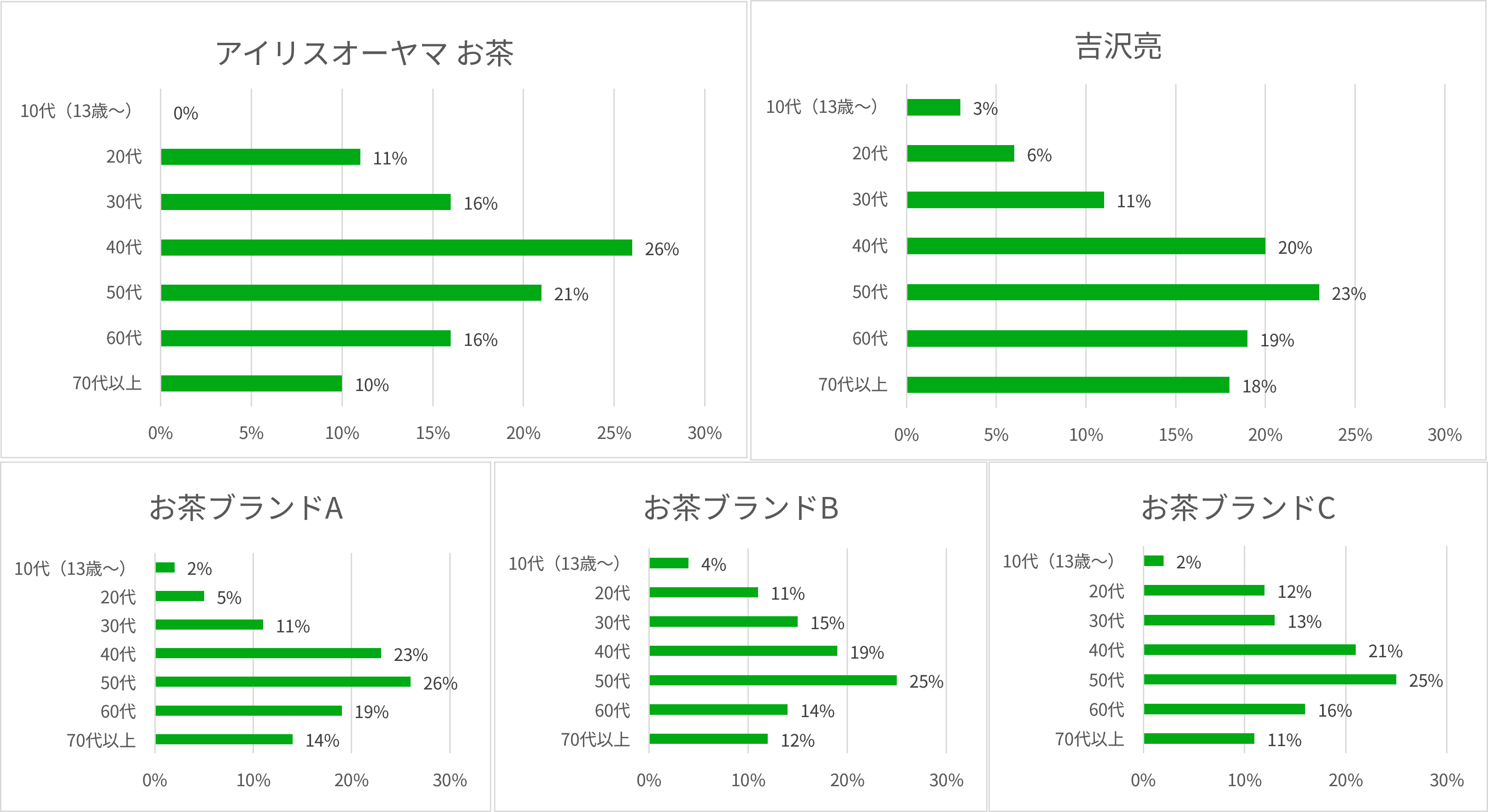 年代別の検索傾向を比較すると、他ブランドが50代をピークとしているのに対し、「アイリスオーヤマ お茶」は40代が最多で、次いで50代となっています。また、他社に比べて20~30代の検索割合が高い点も特徴的であり、現在31歳の吉沢亮さんと同世代の層へ強い影響を及ぼしていることが見て取れます。
