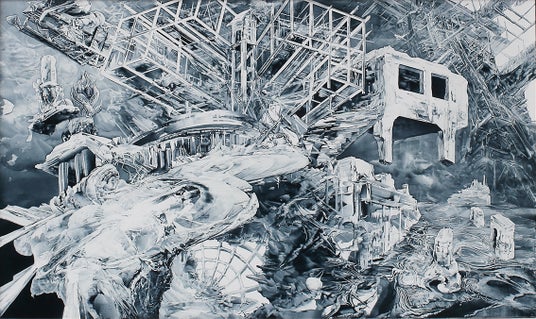 2022年から手掛けている往日後来図(おうじつこうらいず)シリーズの3作目。かつての最先端技術をともなった構造物から着想し、現実とはならなかった現在や未来の姿を描くシリーズ。本作では軍艦島(正式名:端島)・池島から構想をスタートし、技術進歩の最果てと位置付ける宇宙開発への思いをない交ぜに未来予想図を作り上げた。この予想図は別次元の過去のものである。