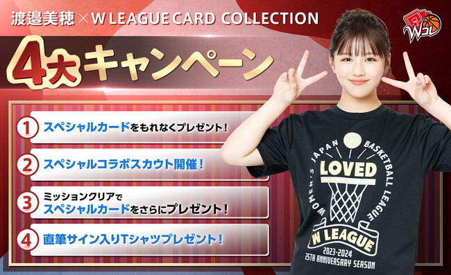 Wコレは、Wリーグに参加する選手たちの決定的な瞬間を豪華なカードにして配信するデジタルトレーディングカードサービスです。今回はWリーグアンバサダーの渡邉美穂さんとのスペシャルコラボレーション4大キャンペーンを開催いたします。