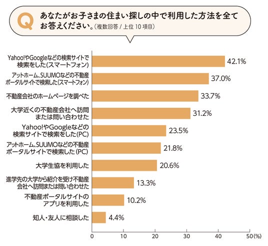 住まい探しで利用した方法について、「Yahoo!やGoogleなどの検索サイトで検索をした(スマートフォン)」が42.1%で1位でした。次いで2位は「アットホーム、SUUMOなどの不動産ポータルサイトで検索した(スマートフォン)」、3位が「不動産会社のホームページを調べた」でした。