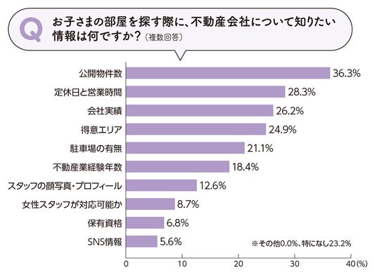新大学生の親が不動産会社について知りたい情報は「公開物件数」が36.3%でトップ、次いで「定休日と営業時間」28.3%、「会社実績」26.2%と続きました。「公開物件数」と「会社実績」がランクインしていることから、新大学生の親は会社規模や実績を重視している傾向が見られました。