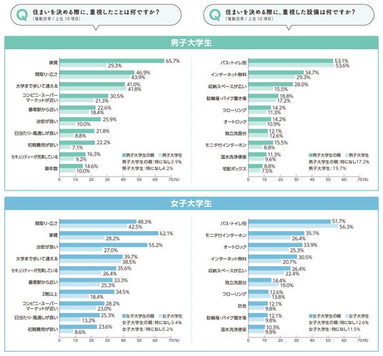 ■大学生の親は「家賃」・「間取り・広さ」を重視。重視した設備は「バス・トイレ」が半数以上でトップ