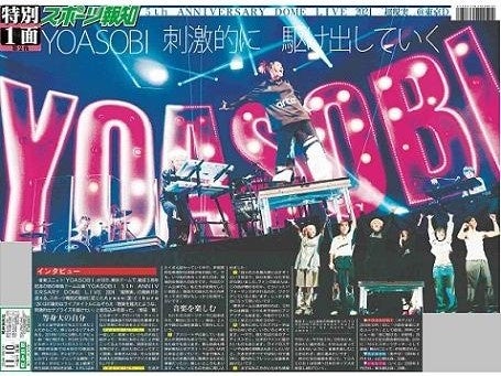 スポーツ報知を発行する報知新聞社(代表取締役社長・依田裕彦)は11月9、10日に開催されたYOASOBIの東京ドーム公演を記念し、両日、会場周辺でYOASOBIを特集した特別1面新聞を販売しました。特別新聞では、2人のインタビューを前編(9日付)、後編(10日付)で掲載しました。会場周辺で販売された特別新聞を、スポーツ報知Yahoo!ショップで販売します。税込160円プラス送料で、特別紙面ページ以外は11月9日付、10日付のスポーツ報知紙面になります。現地にお越しになれなかった方もこの機会にぜひお買い求めください。
