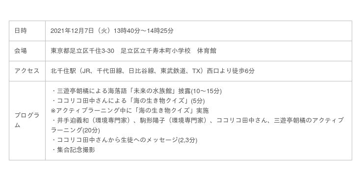 海の落語プロジェクト実行委員会は、落語家が海落語を携えて全国の小中学校に出向き、日本の伝統芸能である落語の“笑い”を通じて、海の現状を面白く伝えるプロジェクト「海の落語プロジェクト」を実施しており、12月7日(火)に三遊亭朝橘による新作海落語披露の出前授業を開催いたします。また、ゲストとして海の生き物に詳しいココリコ田中直樹さんが出演いたします。このイベントは、次世代へ海を引き継ぐために、海を介して人と人とがつながる“日本財団「海と日本プロジェクト」”の一環です。
