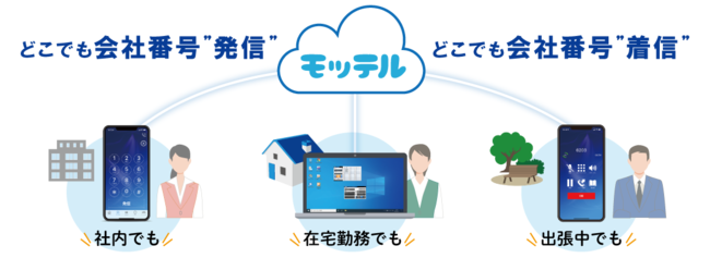 オフィスの移転時にも番号が変わらず、どこでもスマホやパソコンから会社番号で発信、着信ができるクラウド型ビジネスフォンサービスです。