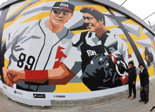 みずほPayPayドーム福岡の外壁に新たなウォールアートがついに完成。ホークスが福岡で築いてきた歴史と伝統を感じられるデザインになっています。本イベントではプロジェクトの発起人である城島健司CBOと、アート制作者の澁谷忠臣さんが参加し、完成した巨大壁画をお披露目しました。