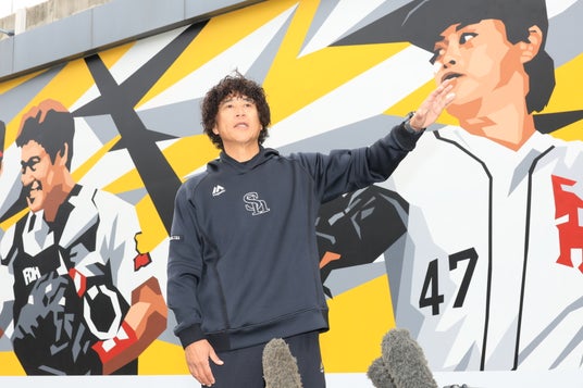「この壁画のメンバーに自身を選んでいただき光栄です。例えば、親子でこの前を通る際に、お父さんお母さんが子どもたちに王監督はこういうことをされた方なんだよ。小久保監督は現役時代はこんなバッターだったんだよというような話をできる場所になり、それを聞いた子どもたちがさらに次の世代に伝えていってほしいです。また、ホークスの選手たちにはここに描かれるような選手になることを目指してプレーしてほしいです。」