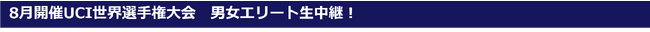 『UCI自転車世界選手権大会(イギリス・グラスゴー大会)』の男女エリート ロードレースと個人タイムトライアルを生中継します。今年の世界選手権は、13種目の自転車競技が同じ場所、同じ期間で開催される史上初の大会となります。男女エリート ロードレース日本代表は、新城 幸也選手と與那嶺 恵理選手。各国から、世界チャンピオンのレムコ・エヴェネプール選手他、ワウト・ファンアールト選手、ヤスペル・フィリップセン選手、マチュー・ファンデルプール選手などの注目選手たちが、世界王者の証であるマイヨ・アルカンシェルを巡って出場します。世界ナンバーワン決定戦をお楽しみください。