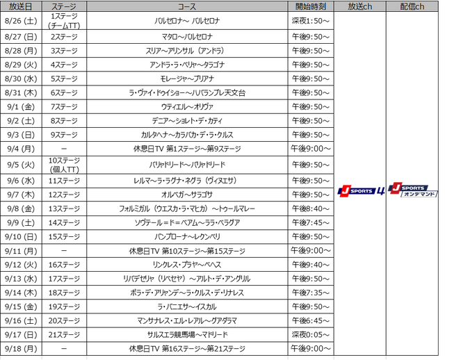 8月26日(土)に開幕するブエルタ・ア・エスパーニャの全21ステージを今年も独占生中継します。さらに、シーズン最後のグランツールの開幕をより多くのサイクルロードレースファンにお届けするため第1ステージの模様をJ:COM及び一部のケーブルテレビ局、スカパー!にて無料放送、J SPORTSオンデマンドで会員無料LIVE配信を行います。また翌日の第2ステージはJ SPORTSサイクルロードレース公式YouTubeチャンネルで無料LIVE配信します。