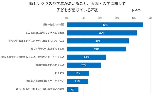 続いて、「どんな同級生が同じクラスになるか」(42%)、「仲の良い友だちとクラスが分かれるかもしれないこと」(37%)、「新しく仲のいい友だちができるか」(35%)といった、人間関係に関する不安が上位を占める結果となりました。