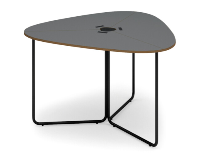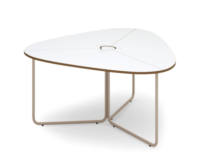 訪問者が話しかけやすく、その場でのペアワークを始められる三角形のテーブル形状です。テーブルについた同士でも会話がしやすく、チームテーブルとしても活用できます。テーブルサイズは、幅1770mm×奥行1700mm、幅1465mm×奥行1390mmの2タイプがあり、高さも900mmと720mmからお選びいただけます。