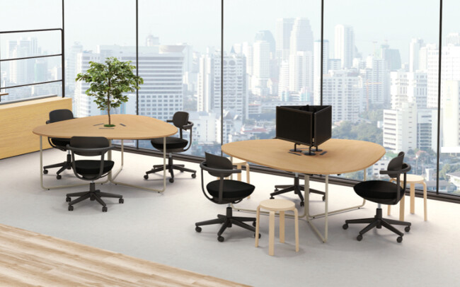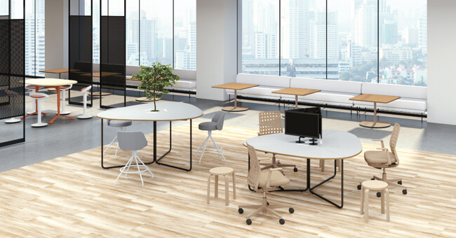 ほかにも、足抜けのよい双柱脚テーブルも加わり、より空間用途に合わせたコーディネートを可能にします。当社は「Franka」で、オフィスでの気軽な交流を生むきっかけづくりに貢献します。