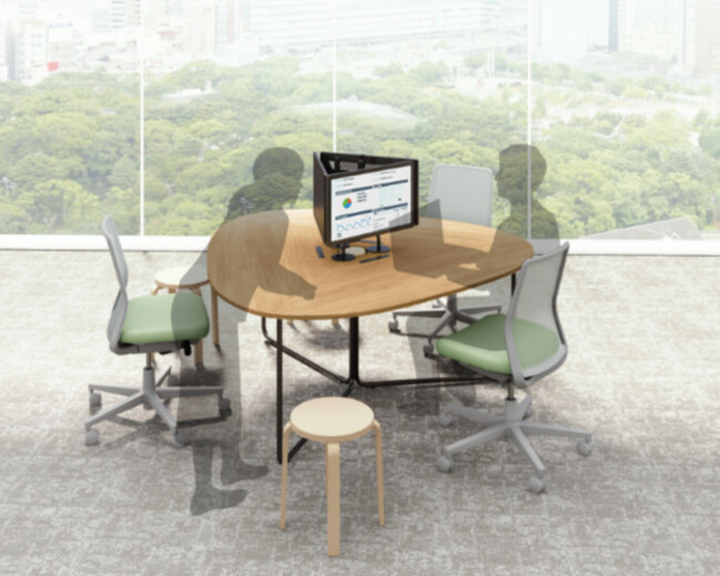 当社は、2020年からカフェテーブルシリーズ「Franka」を販売しています。この度、ラインナップを拡充し、より気軽な対話を生むチームテーブル(コの字脚テーブル)が新登場します。特徴的な三角形のテーブル形状で、訪問者が話しかけやすく、テーブルについた同士でも会話がしやすい環境を実現します。その席の役割によってお選びいただけるよう、リラックス感を演出する植栽や、作業効率の向上を狙ったモニターもご用意しています。また、テーブルの高さは720mmと900mmからお選びいただけます。