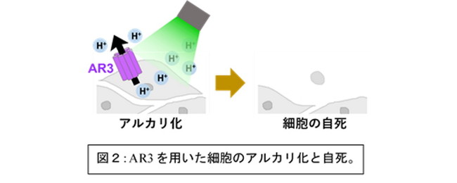 細胞をアルカリ化する光感受性タンパク質を用いることで、光で狙った細胞を死滅させる新技術を開発しました。