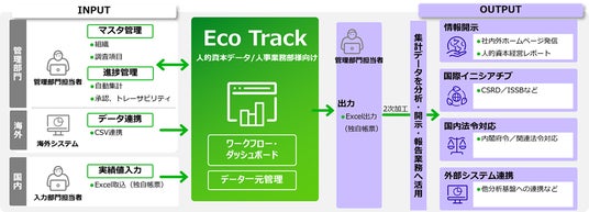 「Eco Track」は企業のサステナビリティ経営に必要となる、人的資本情報やその他非財務情報などの多種多様なデータの収集から集計、開示までをトータルに支援するSaaS型のサービスです。