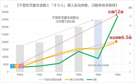AIを活用したアダプティブな対話式 ICT学習教材の開発と提供を行う株式会社すららネット(本社:東京都千代田区、代表取締役:湯野川孝彦)の「すらら」は、教材の特長から2019年の鳥取県教育委員会の不登校支援事業で不登校児童生徒の学習教材として導入が始まりました。その後導入自治体数は5年間で6.5倍、ID数(利用児童生徒数)は12倍に増加※1しています。