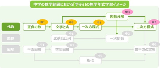 教科書通りに進めると、例えば中学数学では1学期に代数、2学期に関数、3学期に図形を学びます。「すらら」は、代数から始まり正負の数、文字と式、一次方程式または因数分解からの二次方程式へと、理解を積み上げる独自の「体系カリキュラム」で構成した「無学年式」で学習を進めます。習得した知識に連続して新しいことを学び理解を積み上げるので、効率よく根本的な理解で本質的な学習を促進します。このため、学年にこだわらず、自分のペースで学習を進めることができます。