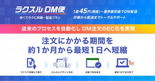 印刷・集客支援のプラットフォームを運営するラクスル株式会社(本社:東京都港区、代表取締役社長 グループCEO:永見世央、以下:当社)と、セイノーグループの株式会社地区宅便(本社:東京都練馬区、代表取締役社長 河合秀治、以下:地区宅便)は、1通45円(税抜)~の業界最安級*¹のダイレクトメール(DM)サービス「ラクスルDM便」において、従来注文完了までに必要だった「見積もり・デザイン制作・各種データチェック・決済」という人手を介するプロセスを自動化し、オンラインで完結するシステムへと刷新したことをお知らせします。